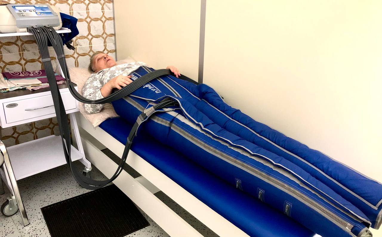 Прессотерапия: в наличии 2 аппарата для прессотерапии – BTL-6000 Lymphastim и ЛИМФА-Мат Диджитал Градиент, в ассортименте полный набор манжет: манжеты для рук, для ног, поясничного отдела, компрессионные штаны, компрессионная куртка. При проведении пневмокомпрессионной терапии снижается отек, улучшается трофика тканей, улучшается кровоснабжение периартикулярных тканей и активируется секреторная функция синовиальной оболочки, улучшается обмен веществ и газообмен. Особенно эффективна терапия, начатая на ранних стадиях, так как это позволяет избежать перехода заболевания в хроническую форму. Обеспечивается эффективная терапия, направленная на ликвидацию лимфастаза и венозного застоя конечностей.