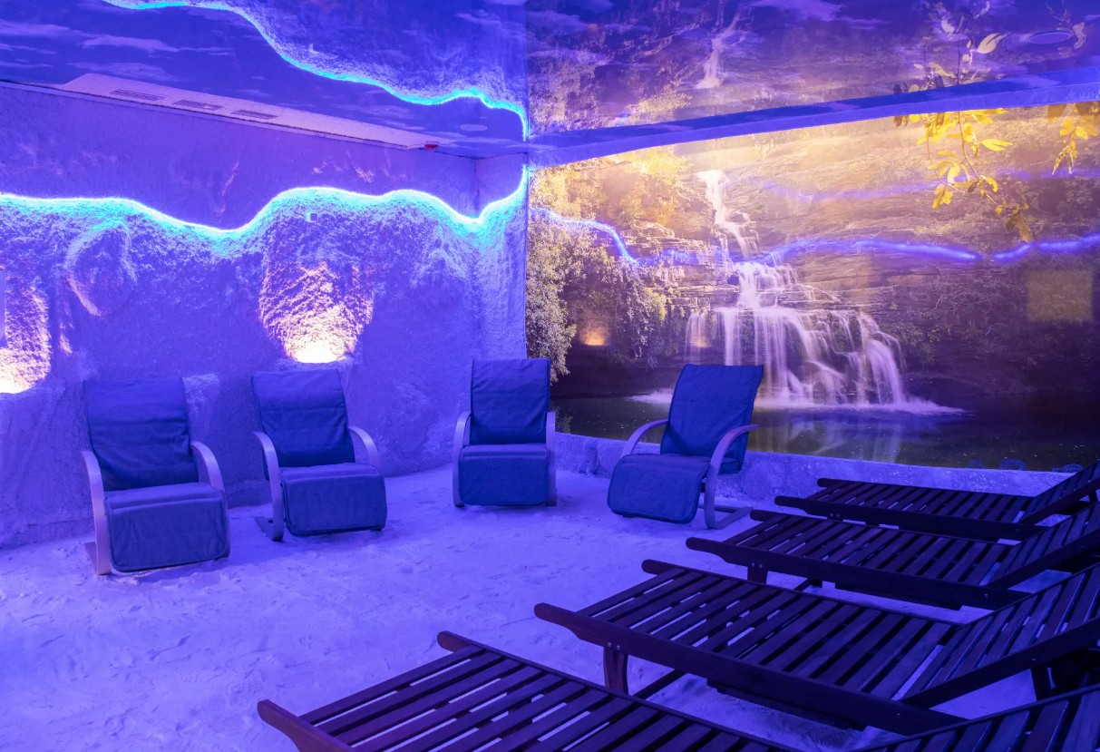 Спелеолечение: процедура зарекомендовала себя как эффективный немедикаментозный метод профилактики, лечения и реабилитации многих заболеваний дыхательной системы. Рассчитана на 10 мест одновременного сеанса. Искусственно воссозданный микроклимат максимально приближен к воздуху природных соляных пещер, которые находятся под землей. Для этого пол и стены выложены специальными солесодержащими материалами. В соляной комнате создан особый интерьер, настраивающий на максимальную релаксацию и исключающий ощущение присутствия в лечебном учреждении. В ней царит приглушенный свет – важное условие для расслабления. Комфорту посетителей способствуют мягкие кресла, шезлонги и приятная музыка.
